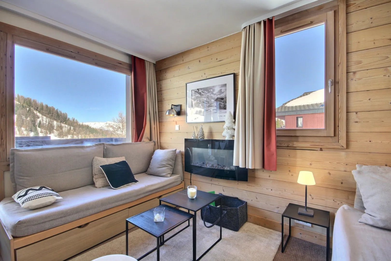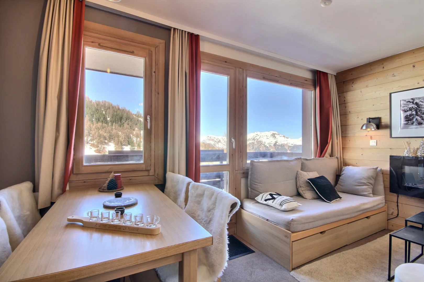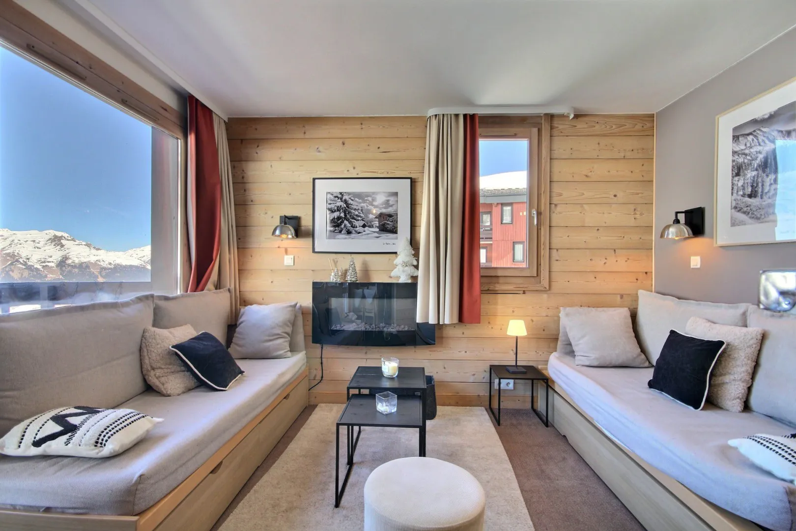 Living-room open onto the balcony : 2 single beds, dining area for 4 people, TV set, electric fireplace